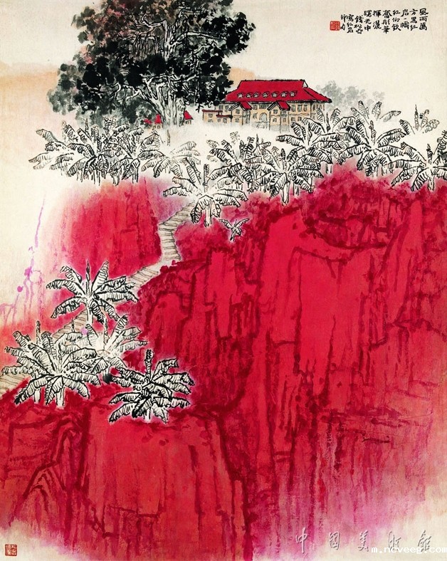 五六十年代,由于对艺术的教育功能的倡导,山水画也在革新的过程中出现了一批以革命纪念地为表现对象的作品,其中《红岩》最具代表性。红岩村为抗战期间中共中央南方局及八路军重庆办事处驻址,1945年毛泽东赴重庆谈判亦寓此。当时年已花甲的钱松嵒满怀激情,以“红”为突破点,大胆地将原址的黄土化为岩石,将泰山的汉柏造型“移植”红岩纪念馆旁,以白描手法画芭蕉丛,避免了红绿对比而使红色得以纯化。那“风雨万方黑,红岩一帜红。仰钦奋彤笔,挥洒曙光中”的五言题诗,正是画家所寄情怀及意匠经营的高度概括。