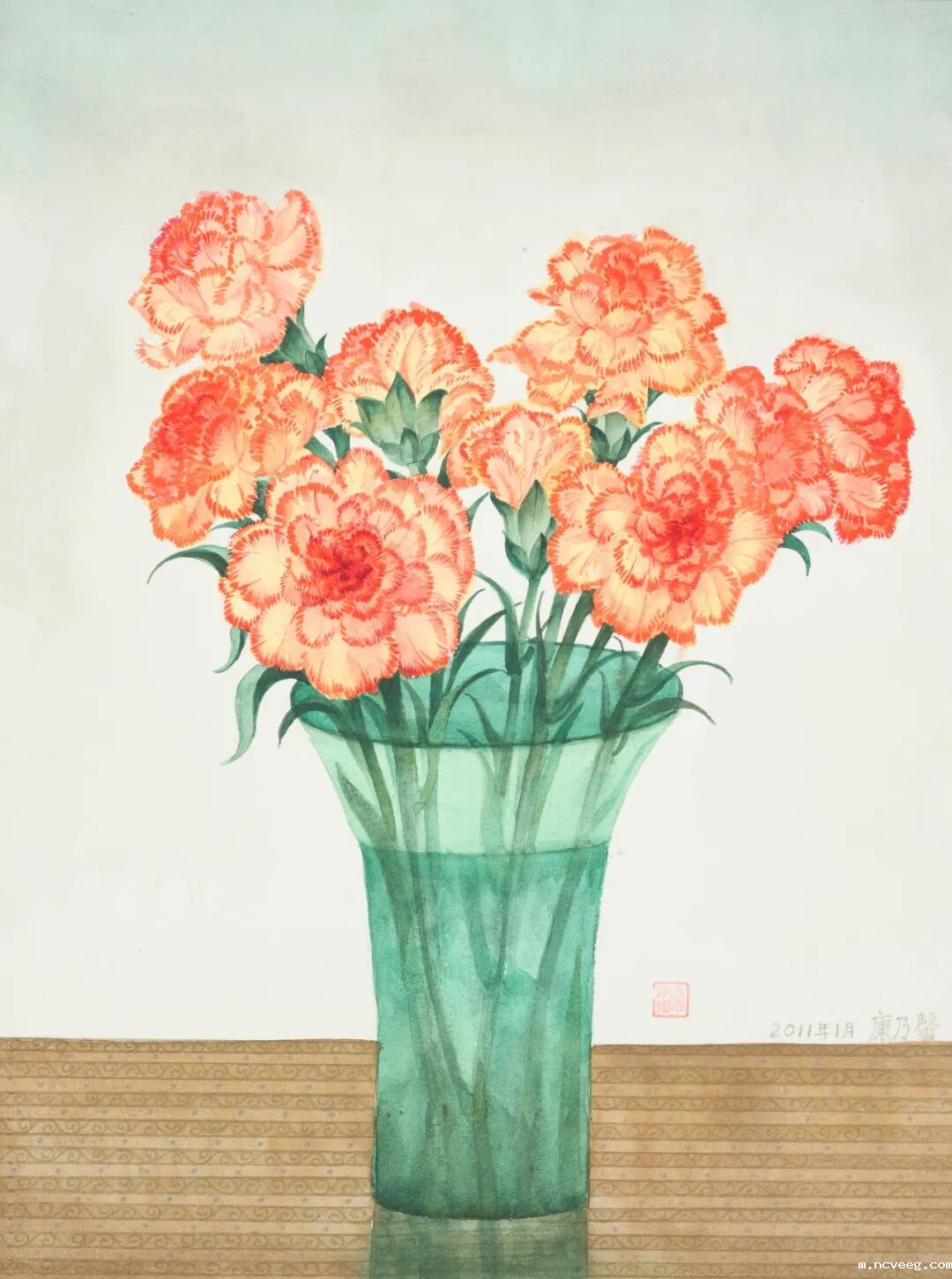 常沙娜先生的《康乃馨》是一幅融合写实精神与装饰美感的工笔重彩佳作,展现了她将自然观察与艺术提炼完美结合的独特风格。画面主体为一束盛放的橙红色康乃馨,插于一个造型简洁的绿色玻璃花瓶中。花朵层层叠叠,姿态各异,既有初绽的花苞,也有完全盛开的硕大花朵,形成丰富的视觉节奏。花茎挺拔,叶片舒展,与花朵共同构成向上生长的生命力。背景以淡雅的灰绿色平涂处理,衬托出花卉的鲜艳,下方木质台面饰有传统卷草纹样,为画面注入东方意蕴。